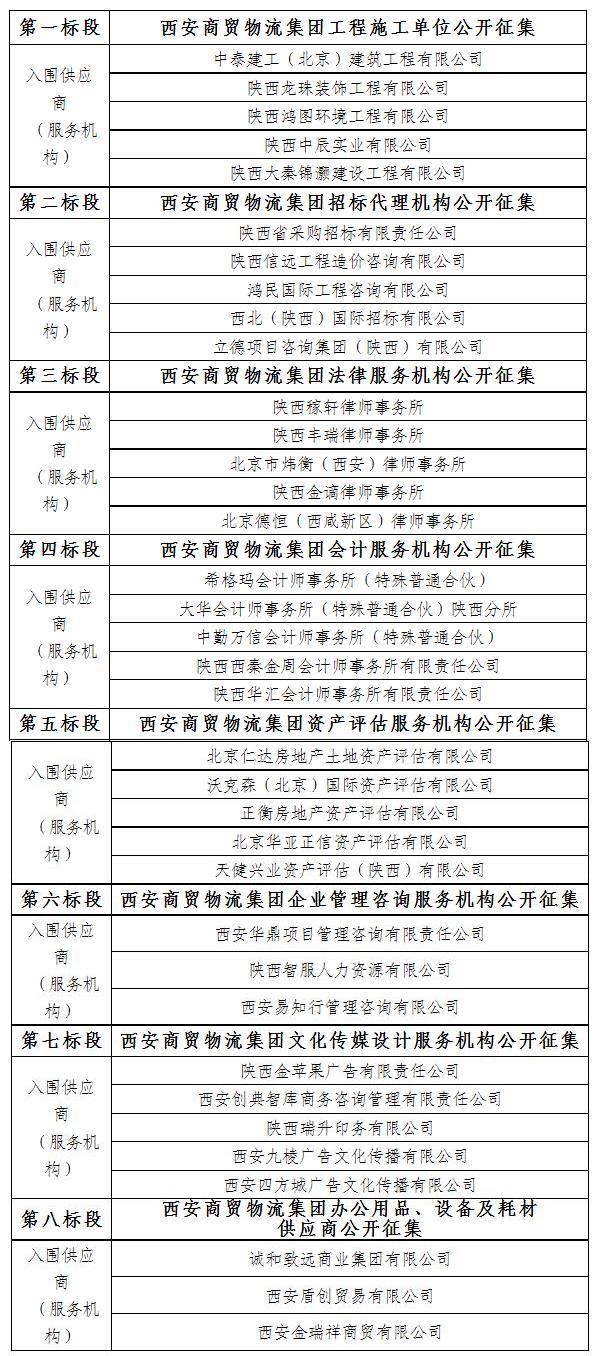 按照我公司關(guān)于西安商貿(mào)物流集團(tuán)供應(yīng)商(服務(wù)機(jī)構(gòu))公開(kāi)征集的公告及相關(guān)要求,本著公開(kāi)、公正、公平的原則,經(jīng)過(guò)相關(guān)程序,確定以下單位入圍我公司供應(yīng)商(服務(wù)機(jī)構(gòu))庫(kù):